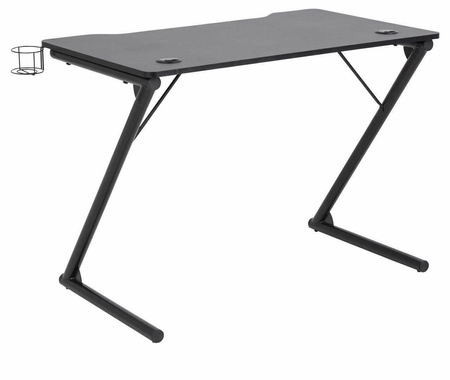 Biuro jest idealne dla miłośników gier komputerowych o prostym, nowoczesnym kształcie. Wyposażone w uchwyt na kubek i wieszak na słuchawki. Blat wykonany z płyty MDF pokrytej czarnym laminatem oraz metalowej podstawy lakierowanej na czarny mat.